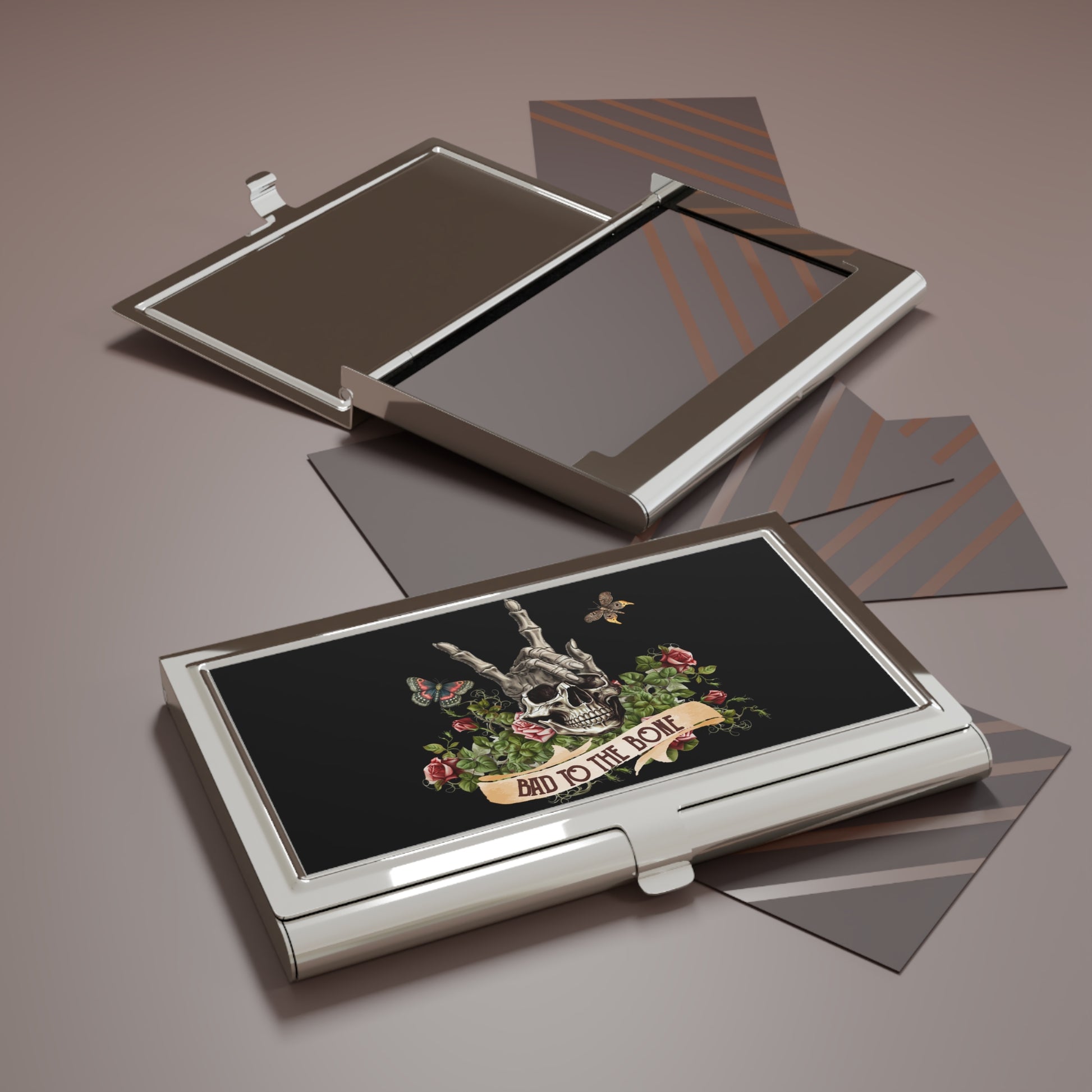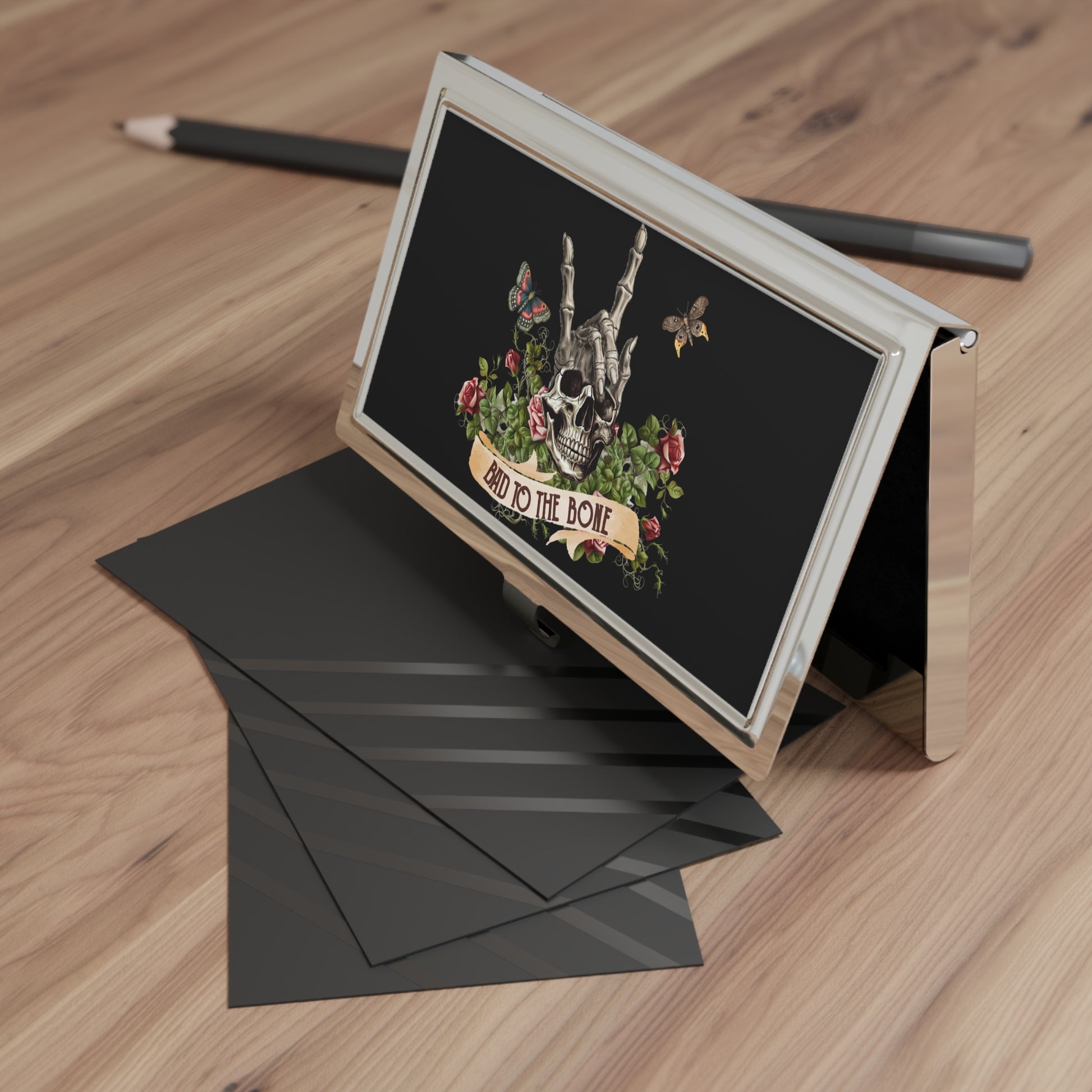 Bad to the Bone Skull Business Card Holder — Gothic Floral Metal Card Case