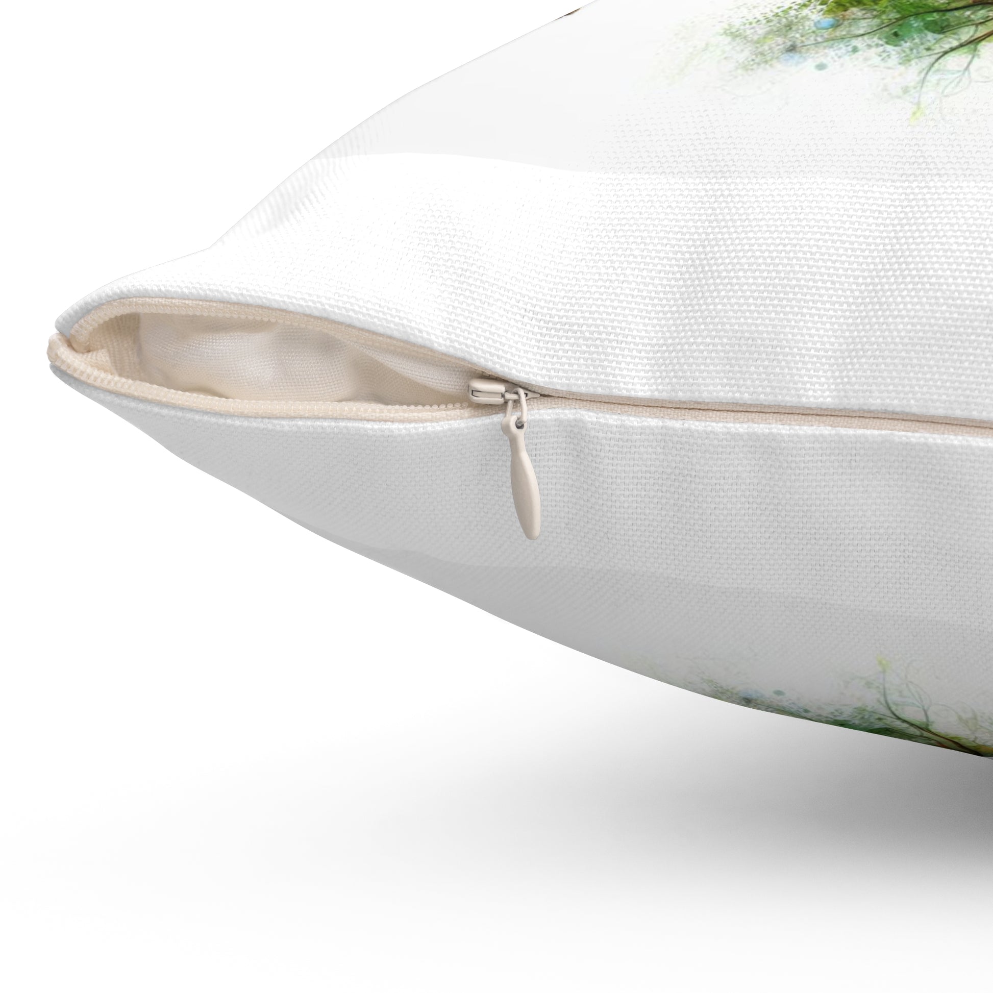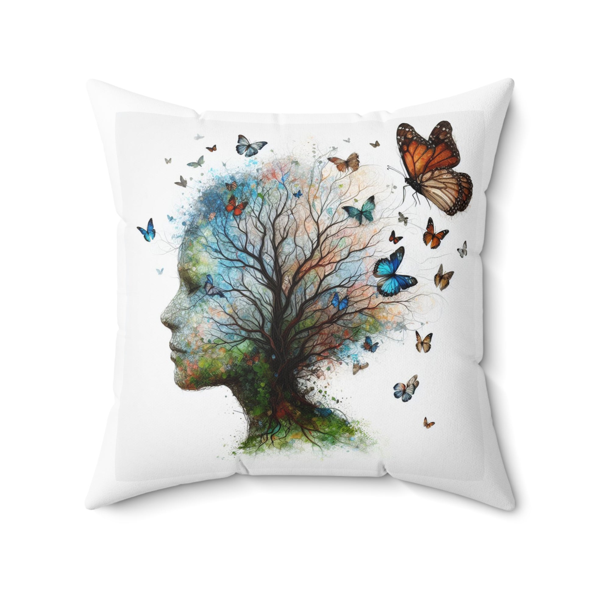 A soft, artful square pillow that brings a quiet, imaginative moment into any room. The double-sided print features a watercolor silhouette where a tree grows from a human profile and butterflies lift into the air — a blend of nature and reverie that reads like a small, personal landscape. The spun polyester cover keeps colors vivid and resists wrinkling, while the recycled-poly insert adds plush volume once assembled. Tuck it on a reading chair, a bedroom bench, or a cozy nook to add a thoughtful accent that invites slow breaths and daydreams.
