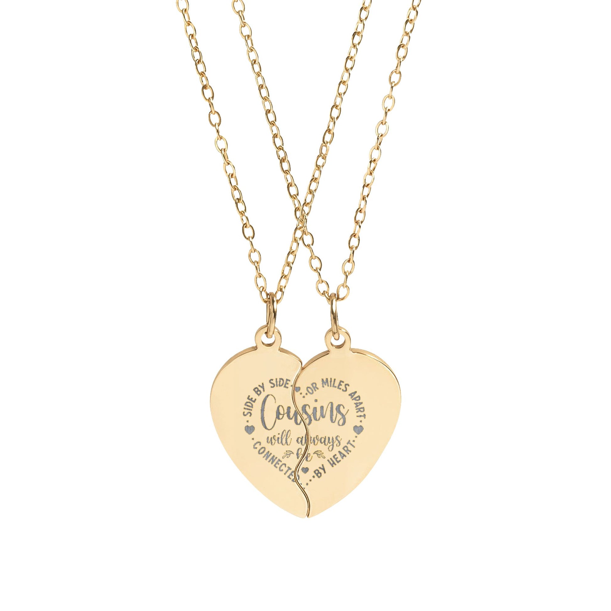 Cousins by chance, friends by choice. This engravable break-apart heart necklace set celebrates your special connection. Available in premium 18K gold PVD coating or stainless steel finish.