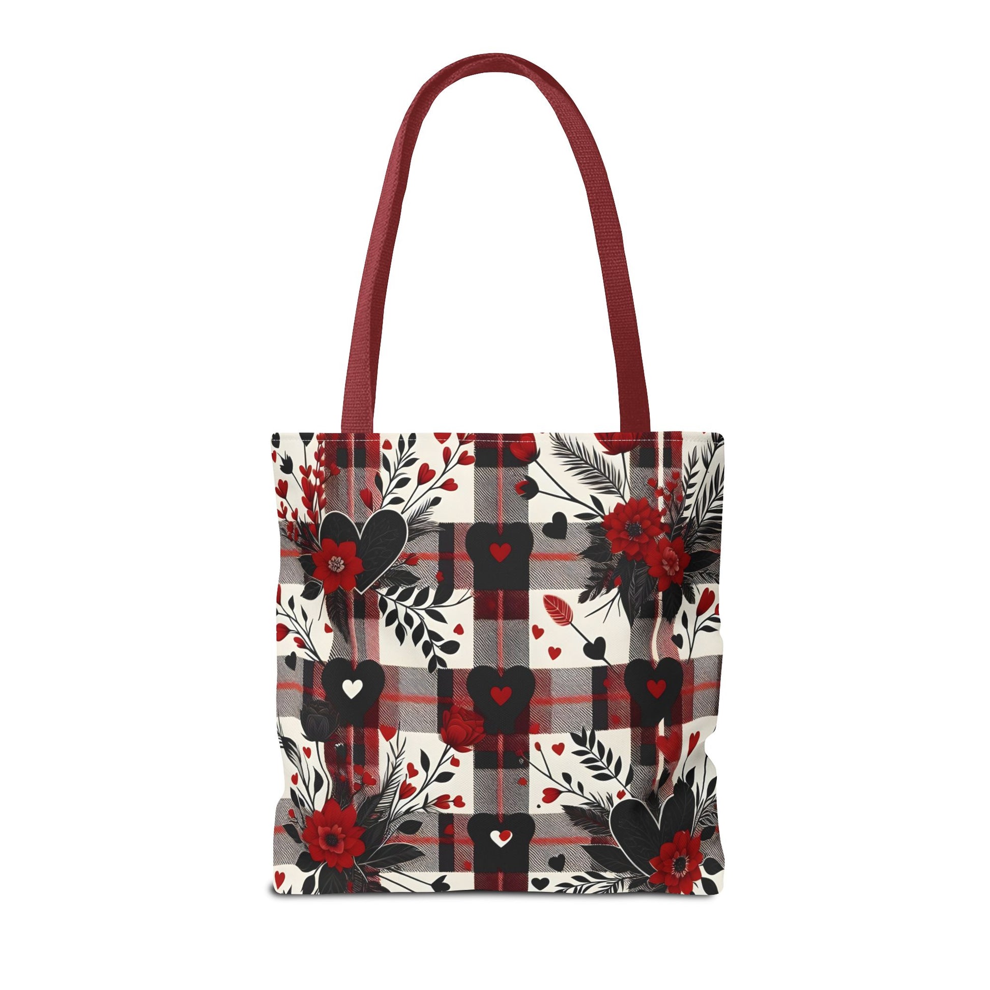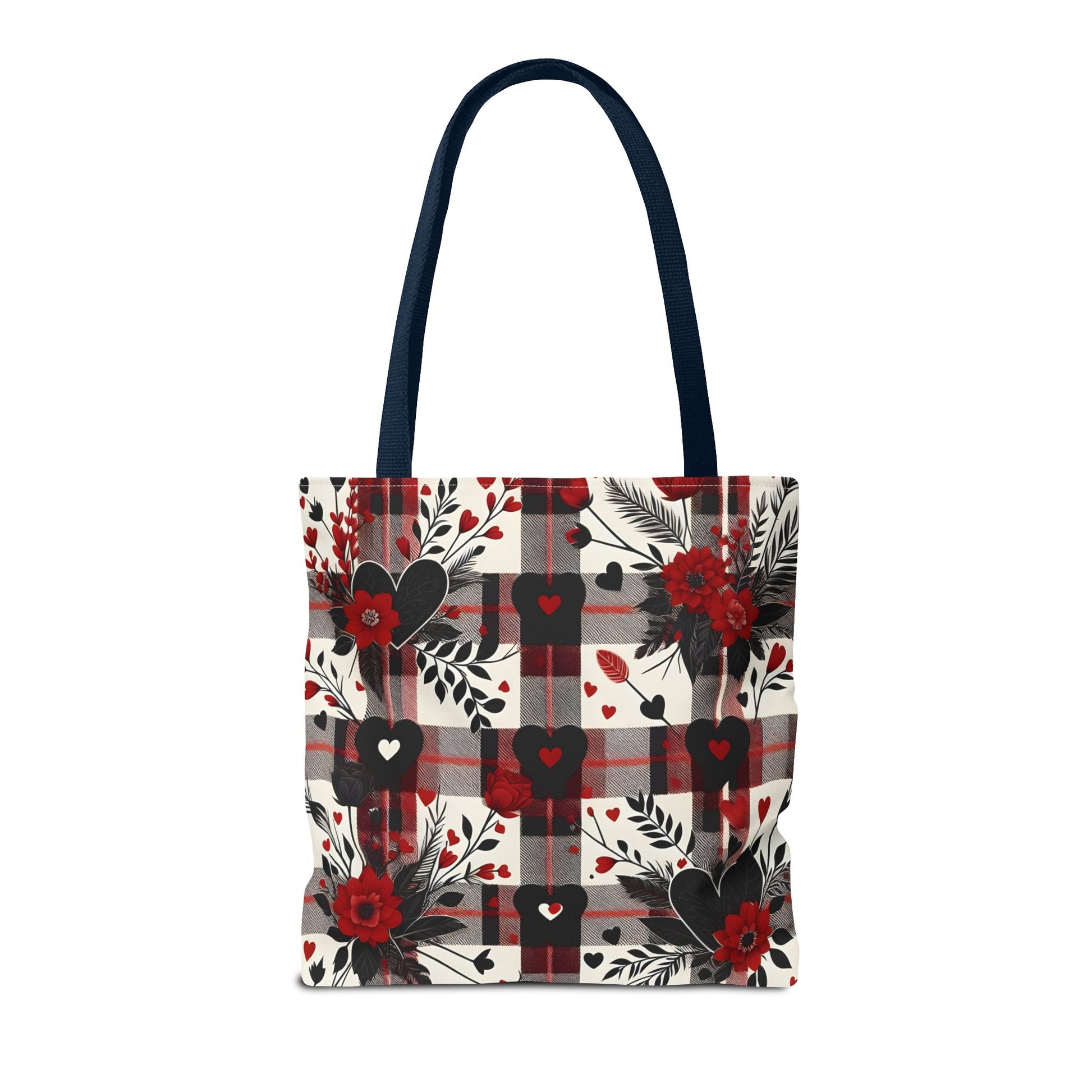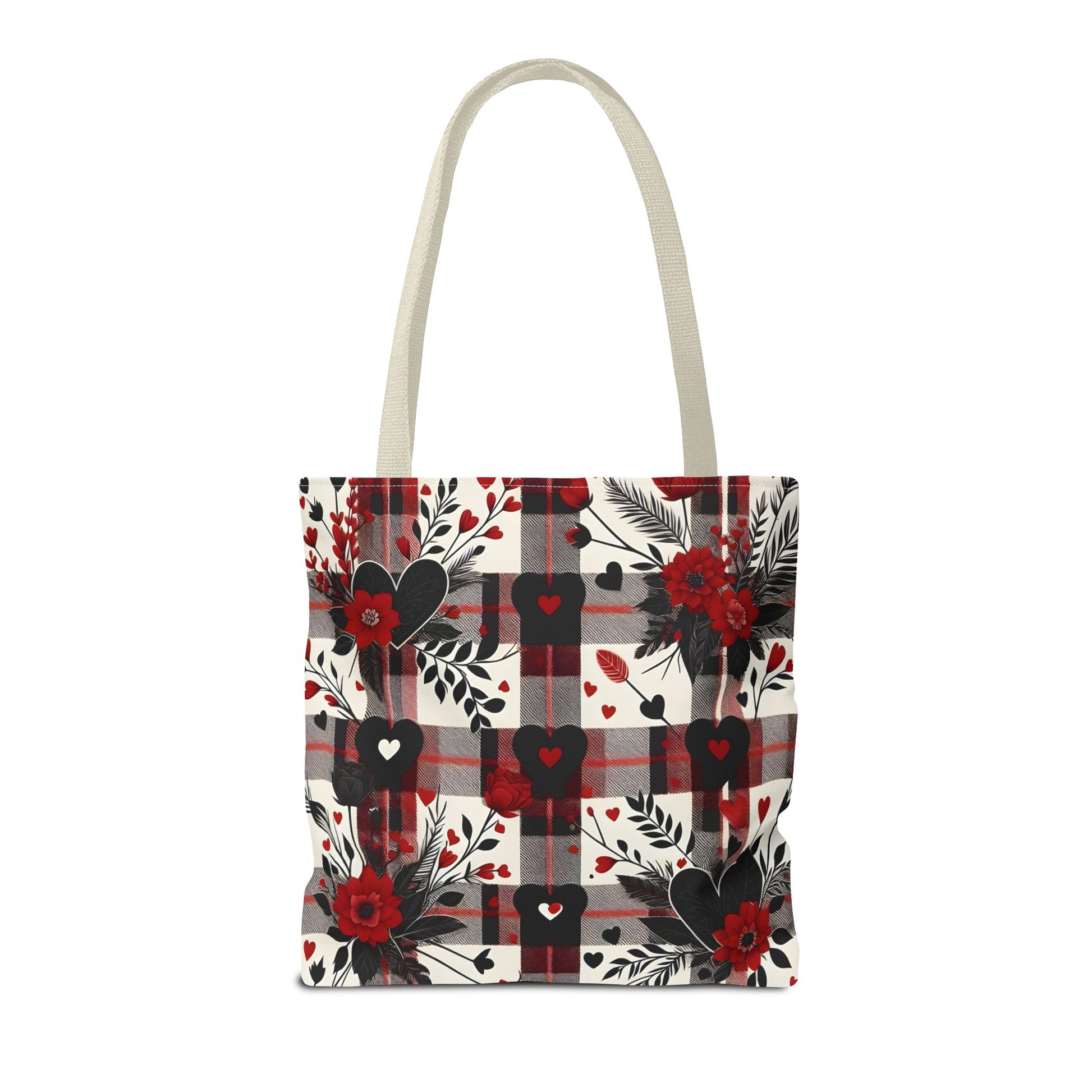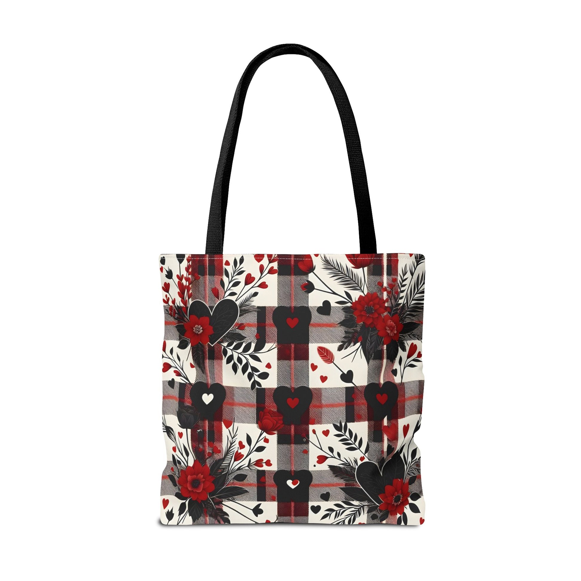 This tote bag features a beautiful design of a red and black plaid pattern with a flowers and heart, giving off a cozy and stylish vibe. Perfect for everyday use, this tote bag is made of 100% polyester, making it extremely strong and durable. It is relevant to those who appreciate floral patterns and want a versatile bag for shopping, work, or outings. Ideal for Valentine's Day, Mother's Day, birthdays, and other special occasions.