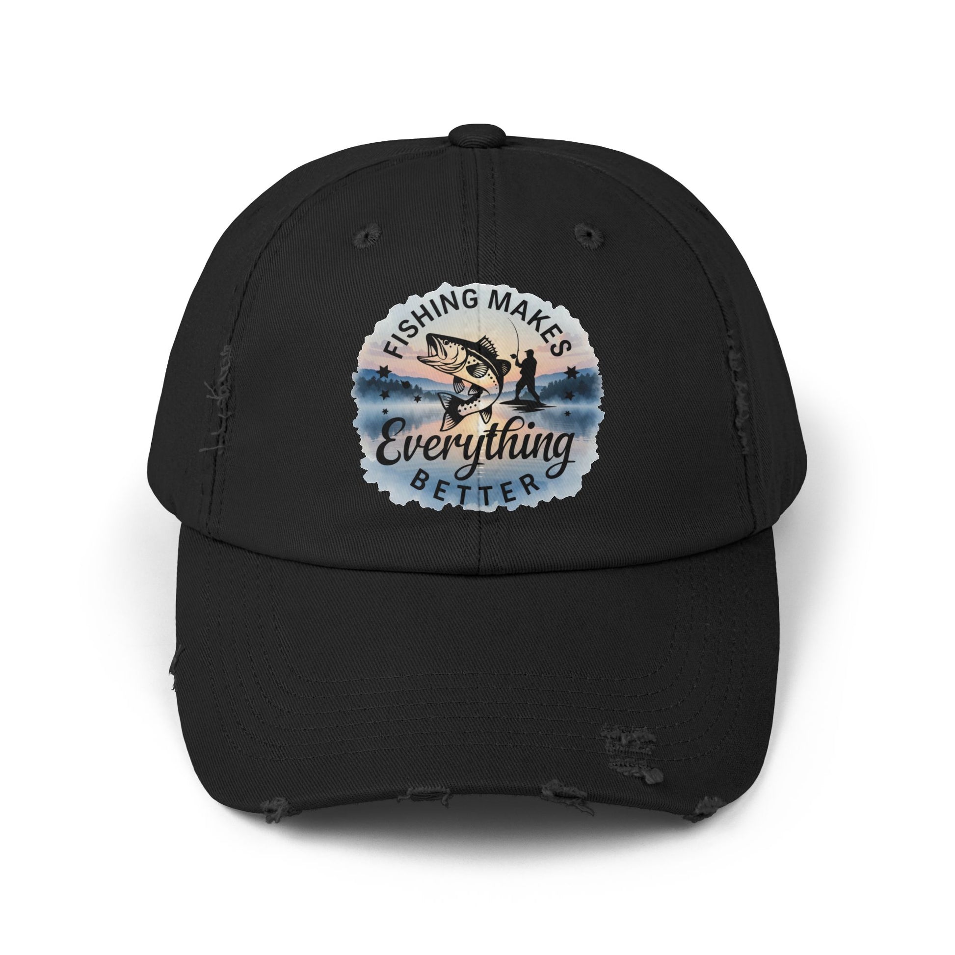 Fishing Humor "Fishing Makes Everything Better" Distressed Cap | Unisex Summer Hat, Fishing Accessories, Outdoor Gear, Gift for Anglers, Casual Headwear