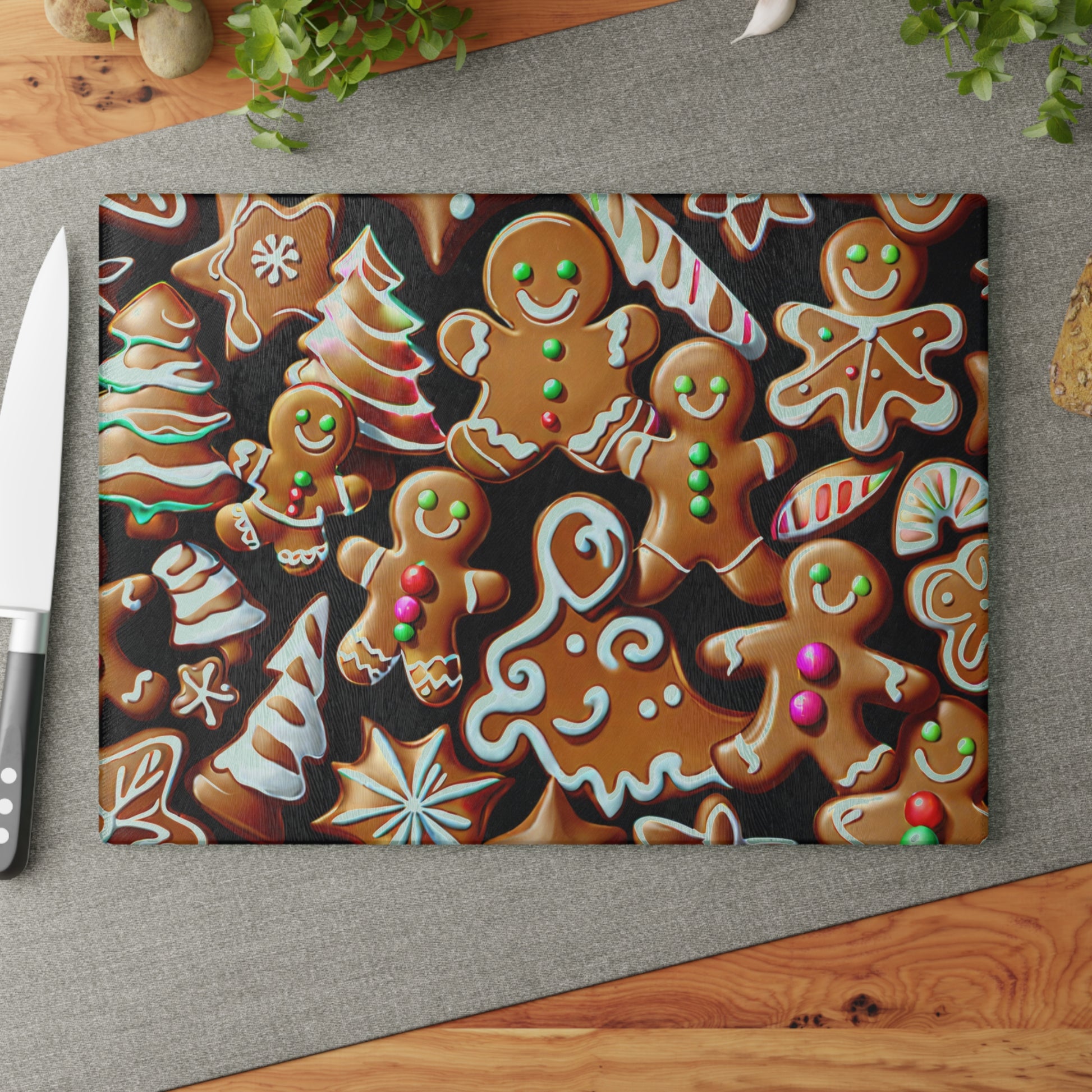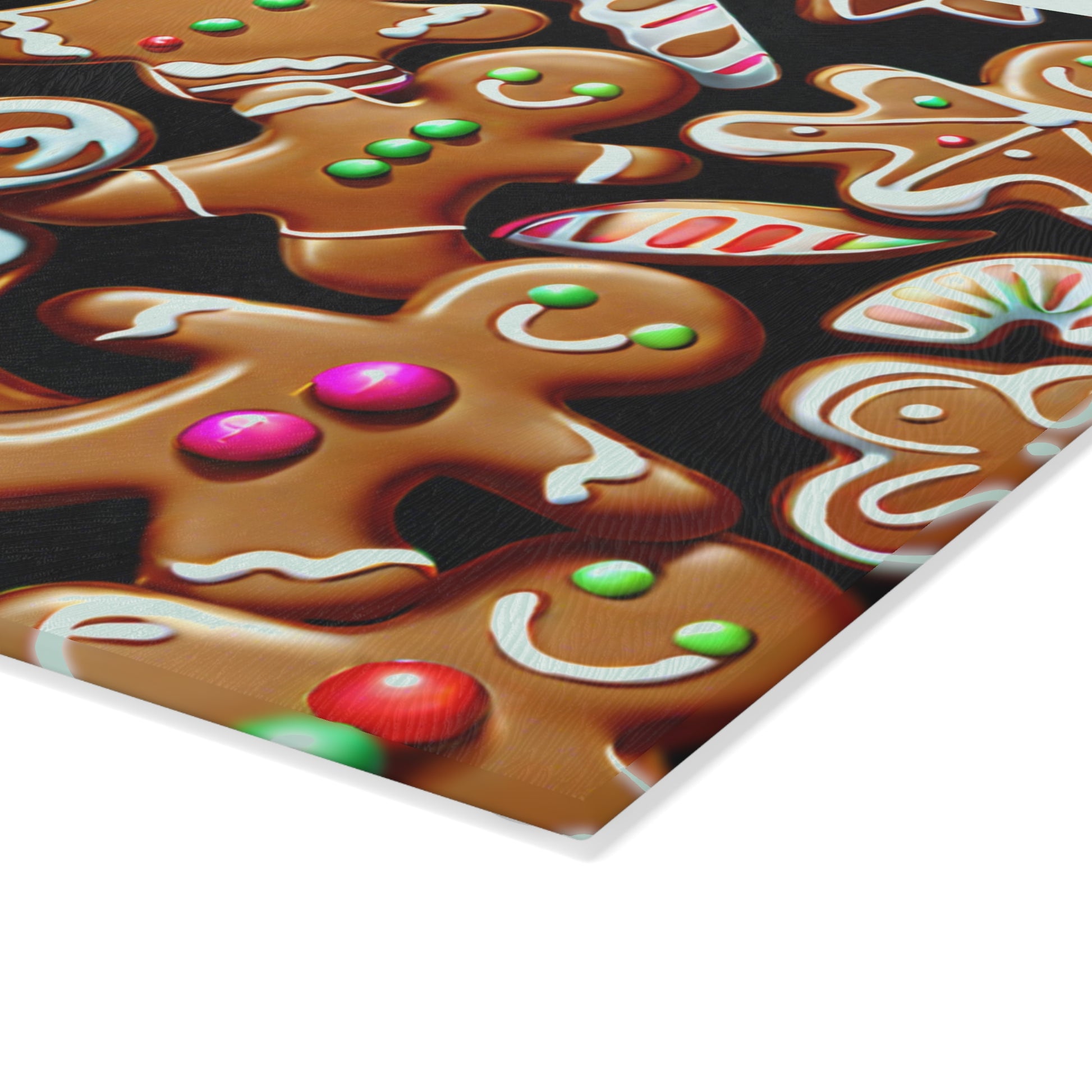Elevate your kitchen with this stunning Glass Cutting Board, perfect for bringing joy and a festive atmosphere to your home. Featuring a vibrant and whimsical design of gingerbread cookies and holiday motifs, it's not just a tool but a beautiful piece for your culinary adventures. Ideal for bakers, home chefs, or anyone who loves to host during the holiday season, this cutting board makes food prep a delightful experience. Whether you're preparing for Christmas gatherings, holiday parties, or just enjoying everyday cooking, this board adds a cheerful touch to any occasion. Its unique printed surface and durable build ensure you'll cherish it for many celebrations to come!