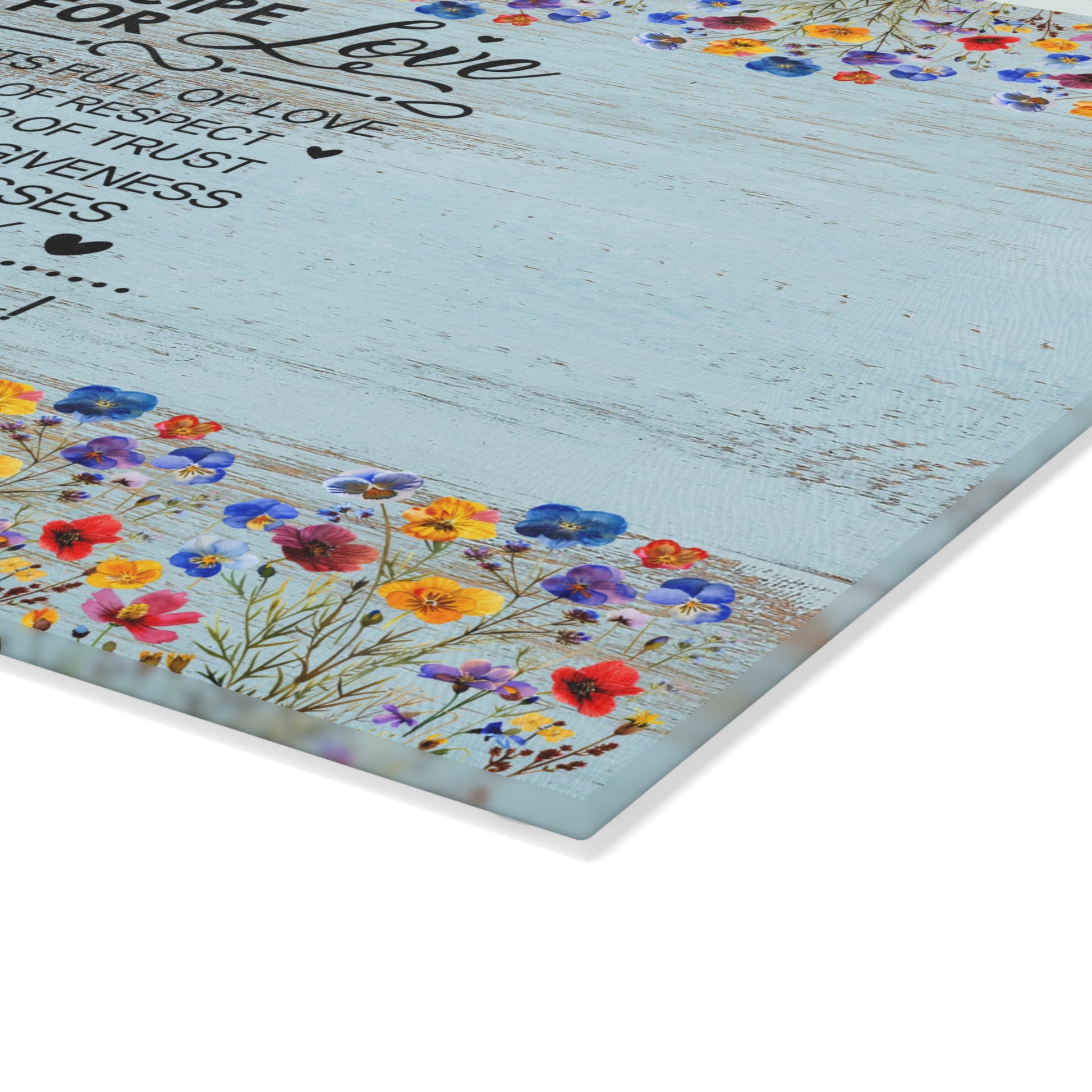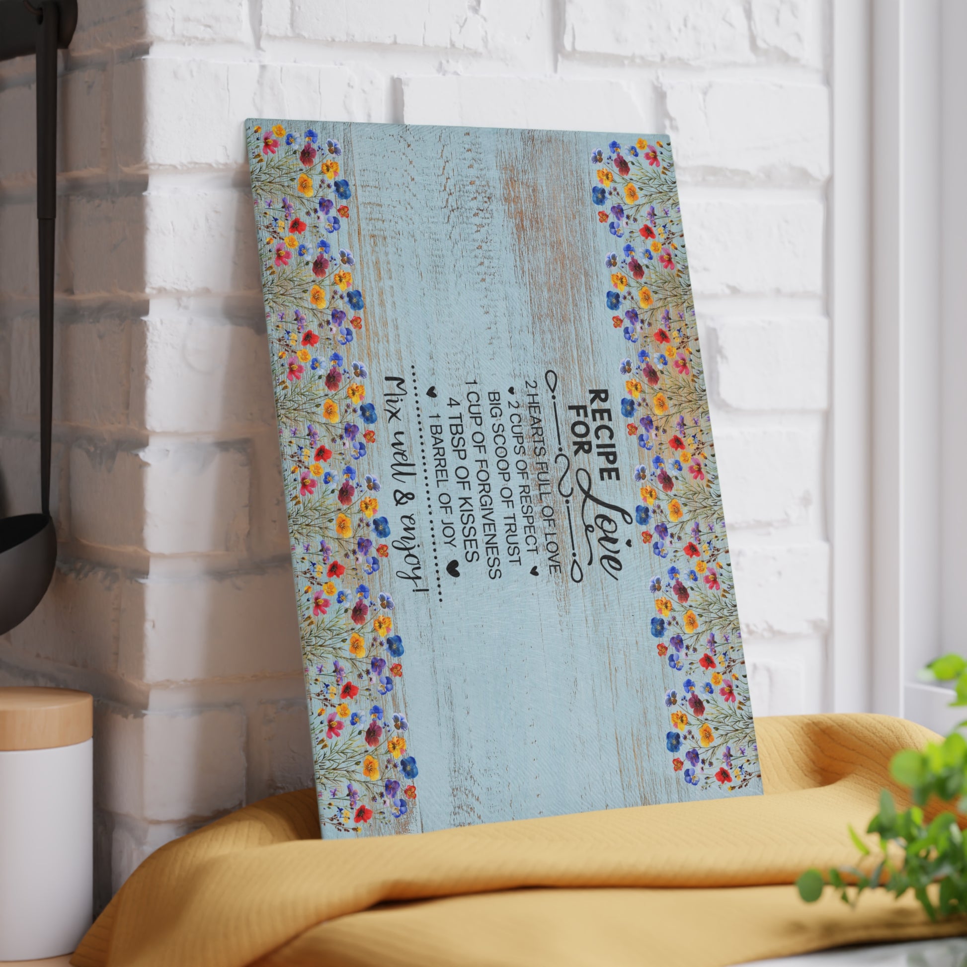 Glass Cutting Board - "Recipe for Love" Floral Kitchen Decor, Decorative Tempered Glass Chopping Board, Wedding & Mother’s Day Gift