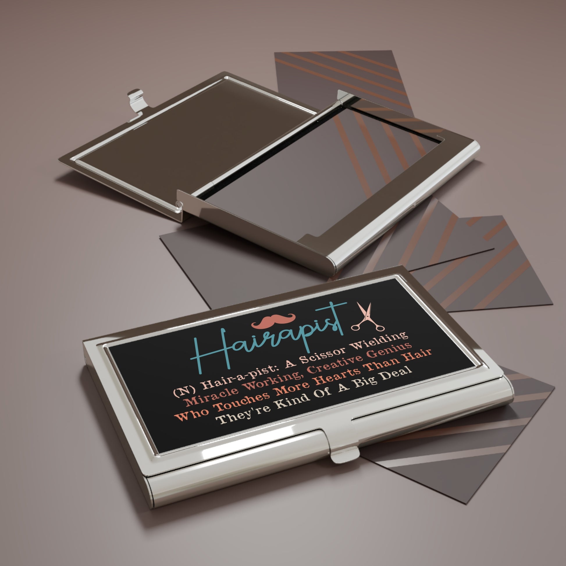 A sleek, metallic business card holder crafted for stylists and salon pros who carry their craft everywhere. The glossy, polished exterior catches light and attention, while the velvet-like interior cradles up to 20 standard cards. On the lid, playful typography and hair-themed accents celebrate the hairstylist’s skill — a small, confident statement piece that slips easily into a pocket or apron. The secure friction snap keeps cards safe between appointments and gives a satisfying click when opened. Carry your cards with a little showmanship and a lot of polish.
