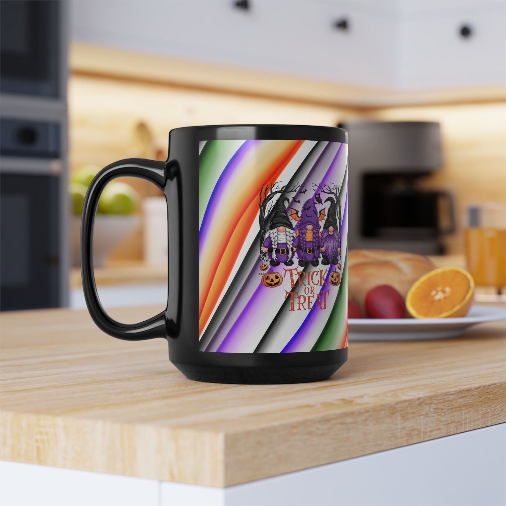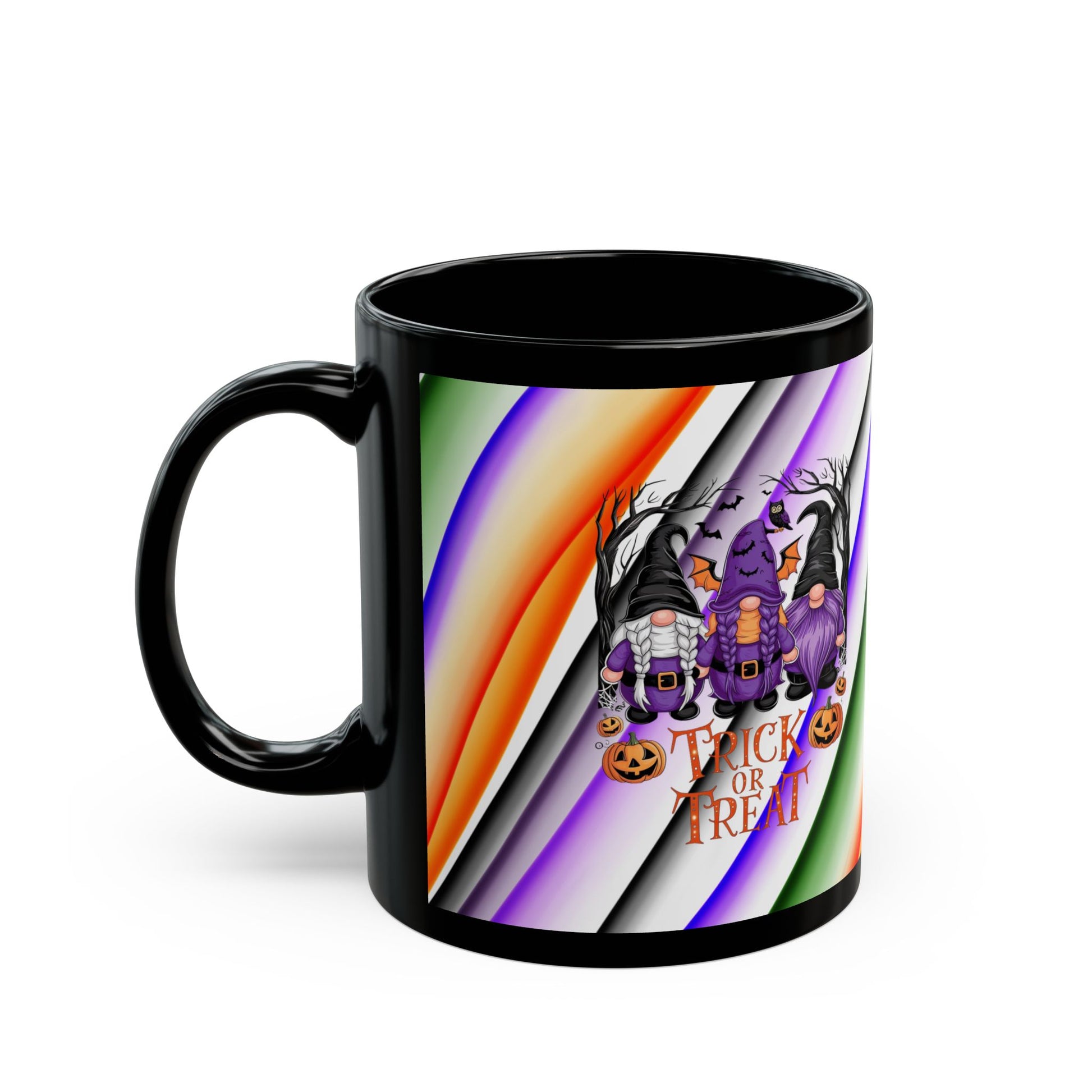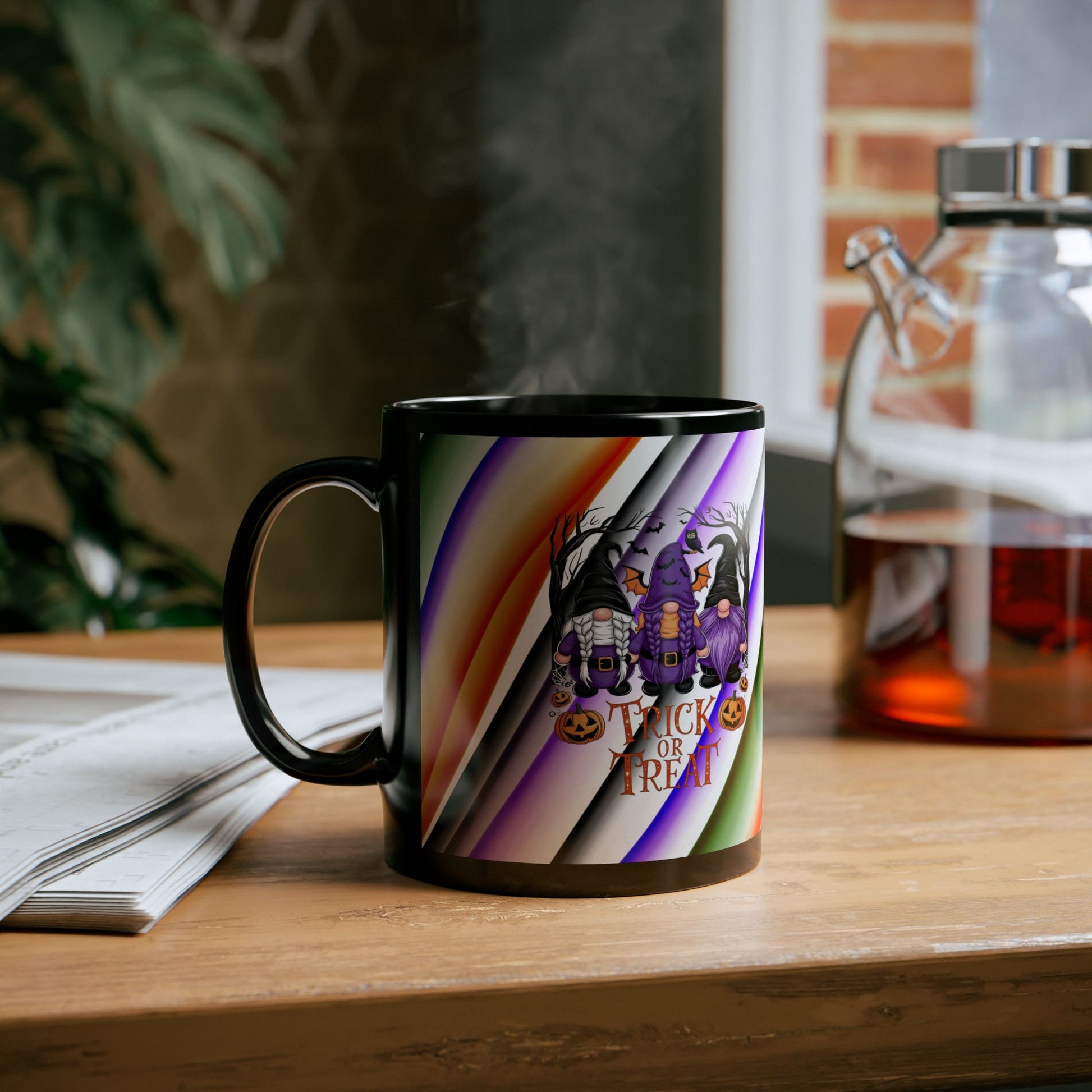 Halloween Theme Black Mug (11oz, 15oz), Cute Halloween Expression with Gnomes, Halloween Lovers, Gnome Lovers, Coffee, Tea, Hot Chocolate Lovers Gift Idea