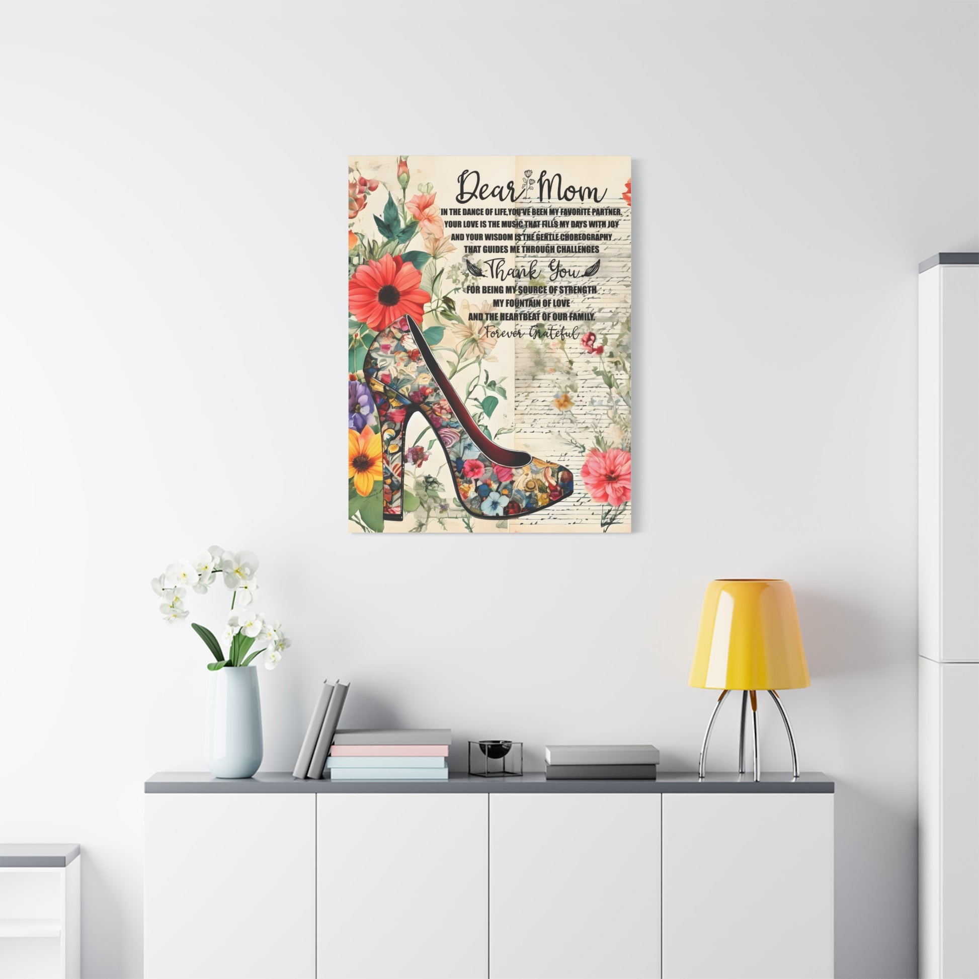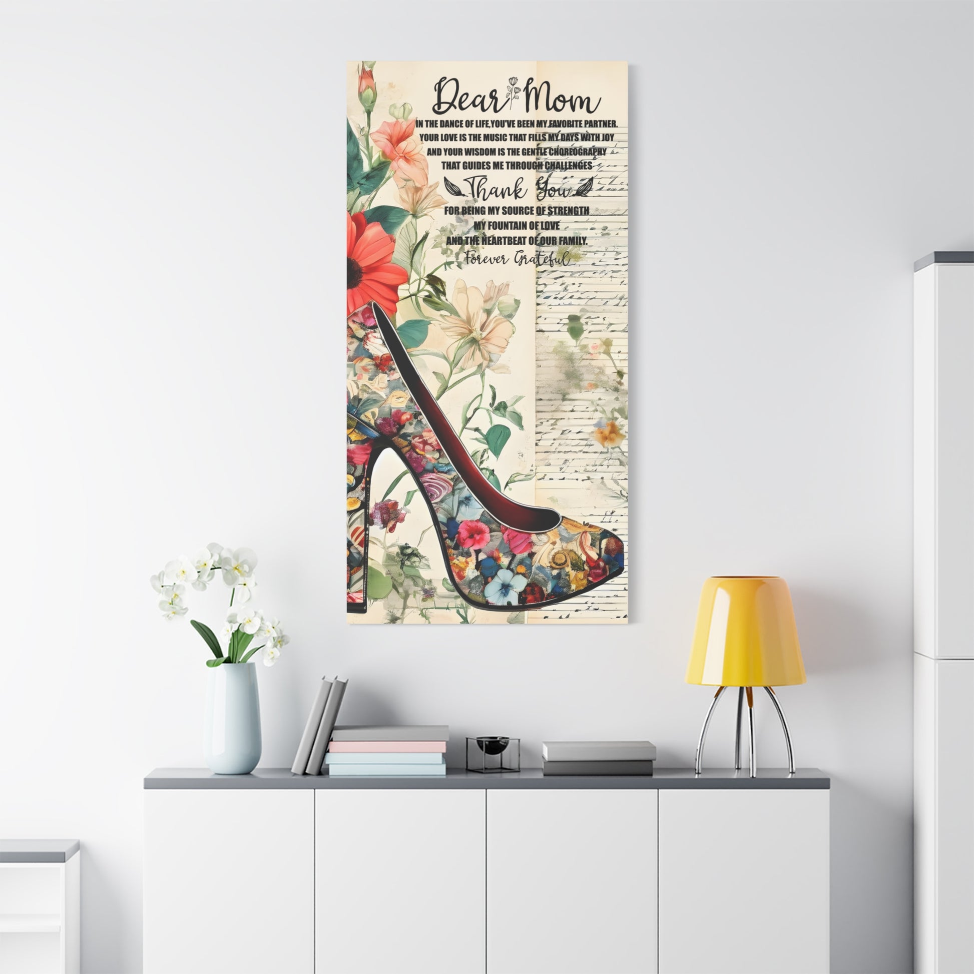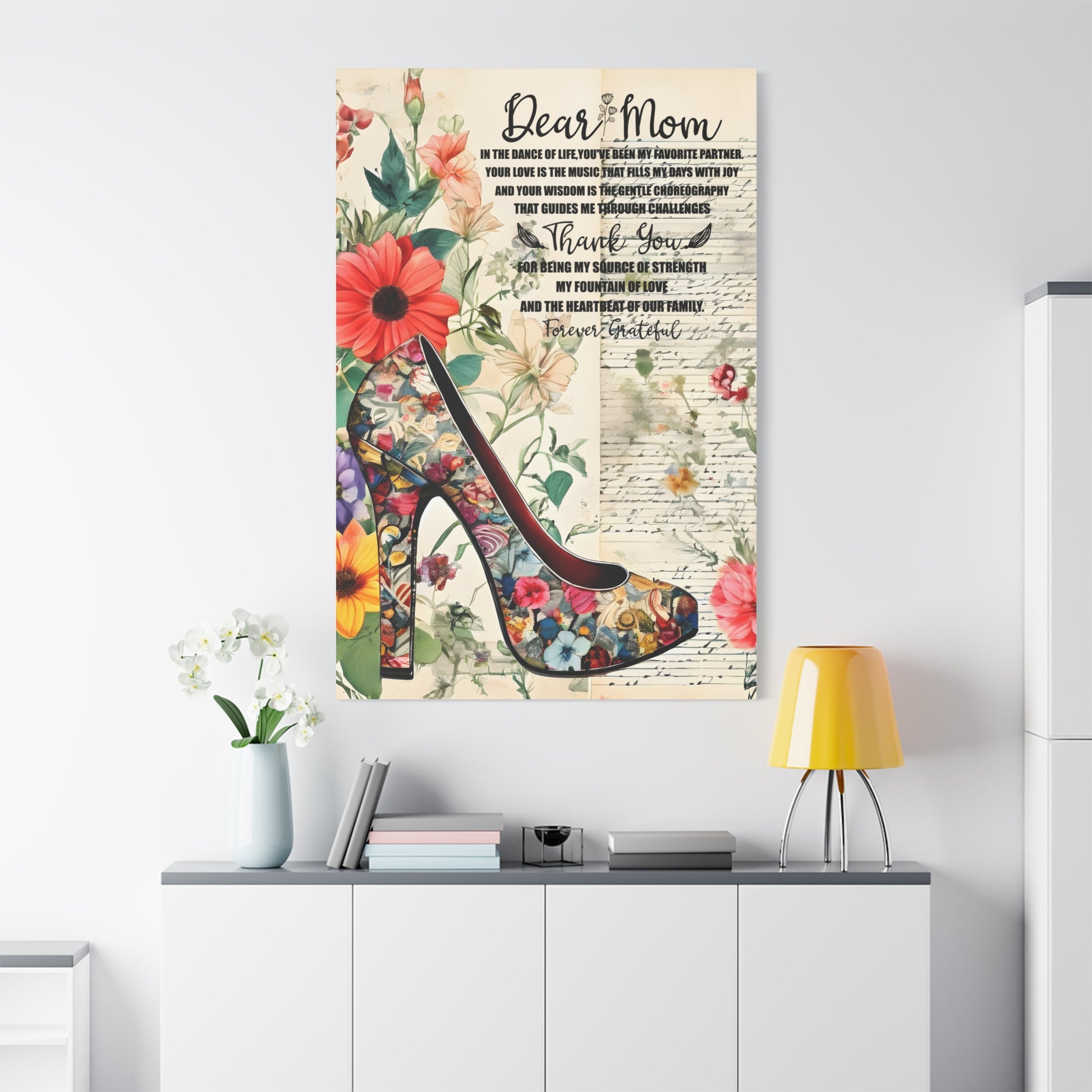 Introducing a beautifully crafted Matte Canvas, a perfect blend of art and heartfelt sentiment. This stunning piece features a floral high-heeled shoe design with an affectionate message to mothers, expressing gratitude and love. Ideal for home decor, it adds a warm and welcoming vibe to any room, making it a thoughtful gift for Mother's Day, birthdays, or simply to celebrate the special bond with your mom. Perfect for those who appreciate artistic expressions of love, this canvas resonates deeply with anyone wishing to cherish their family ties and create a nurturing environment.