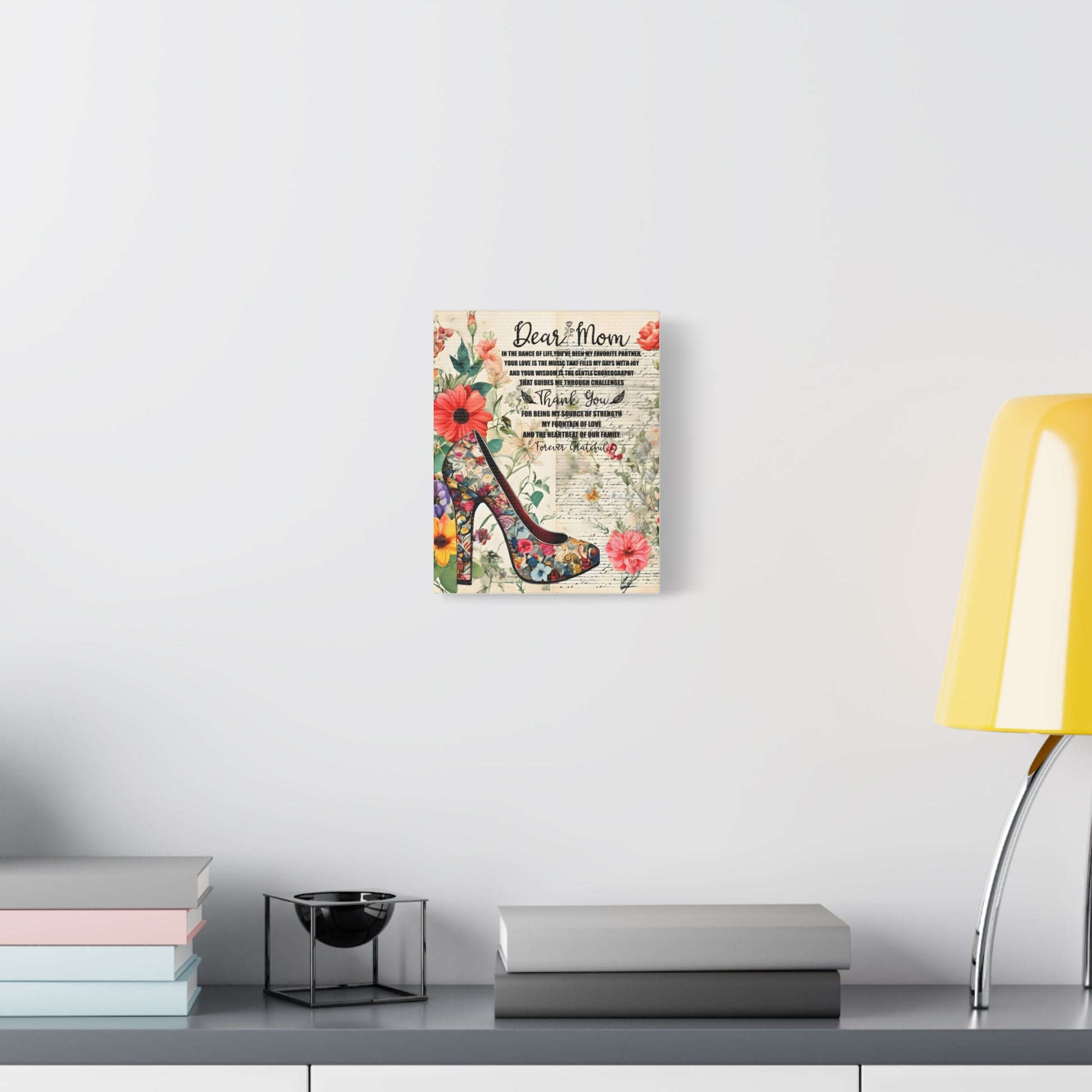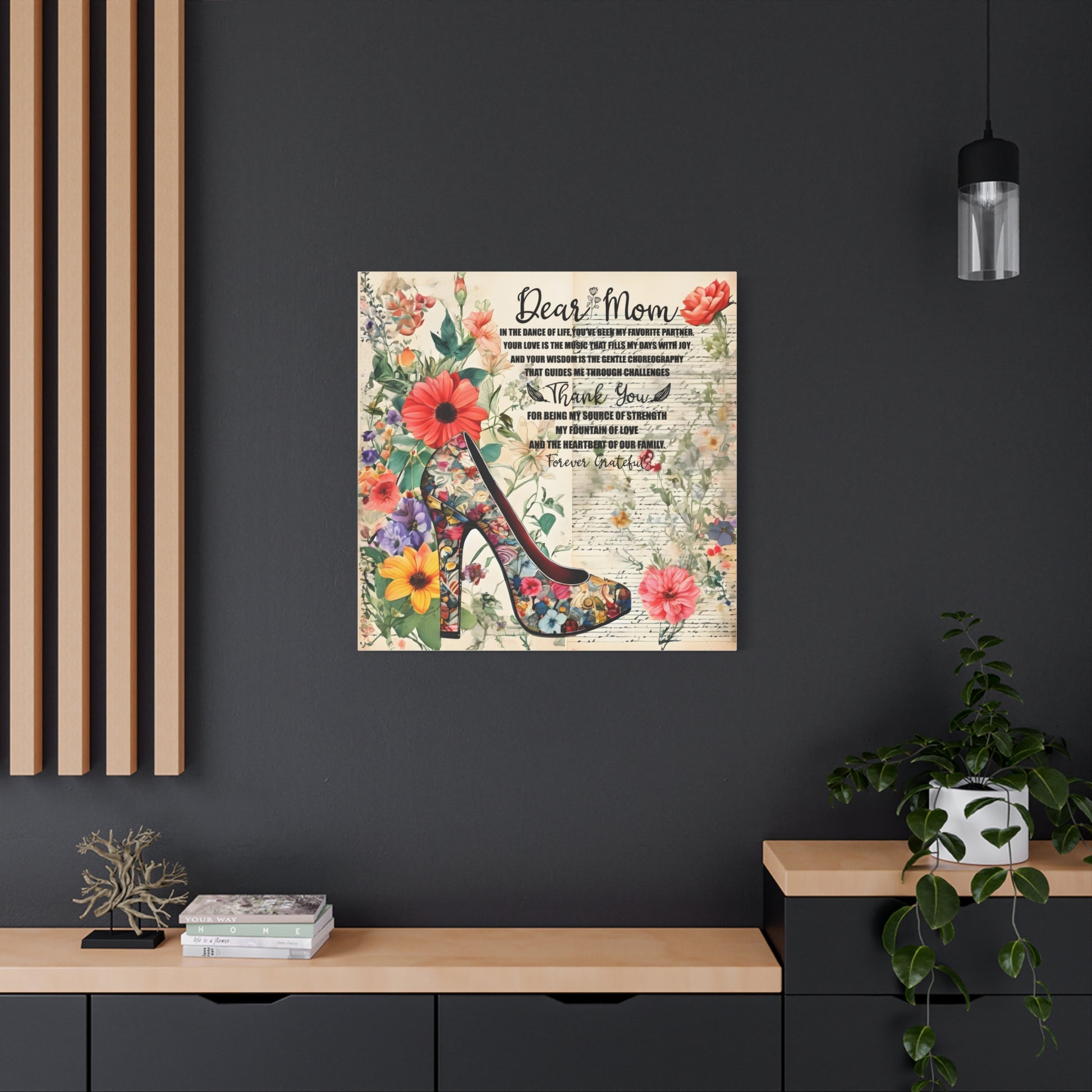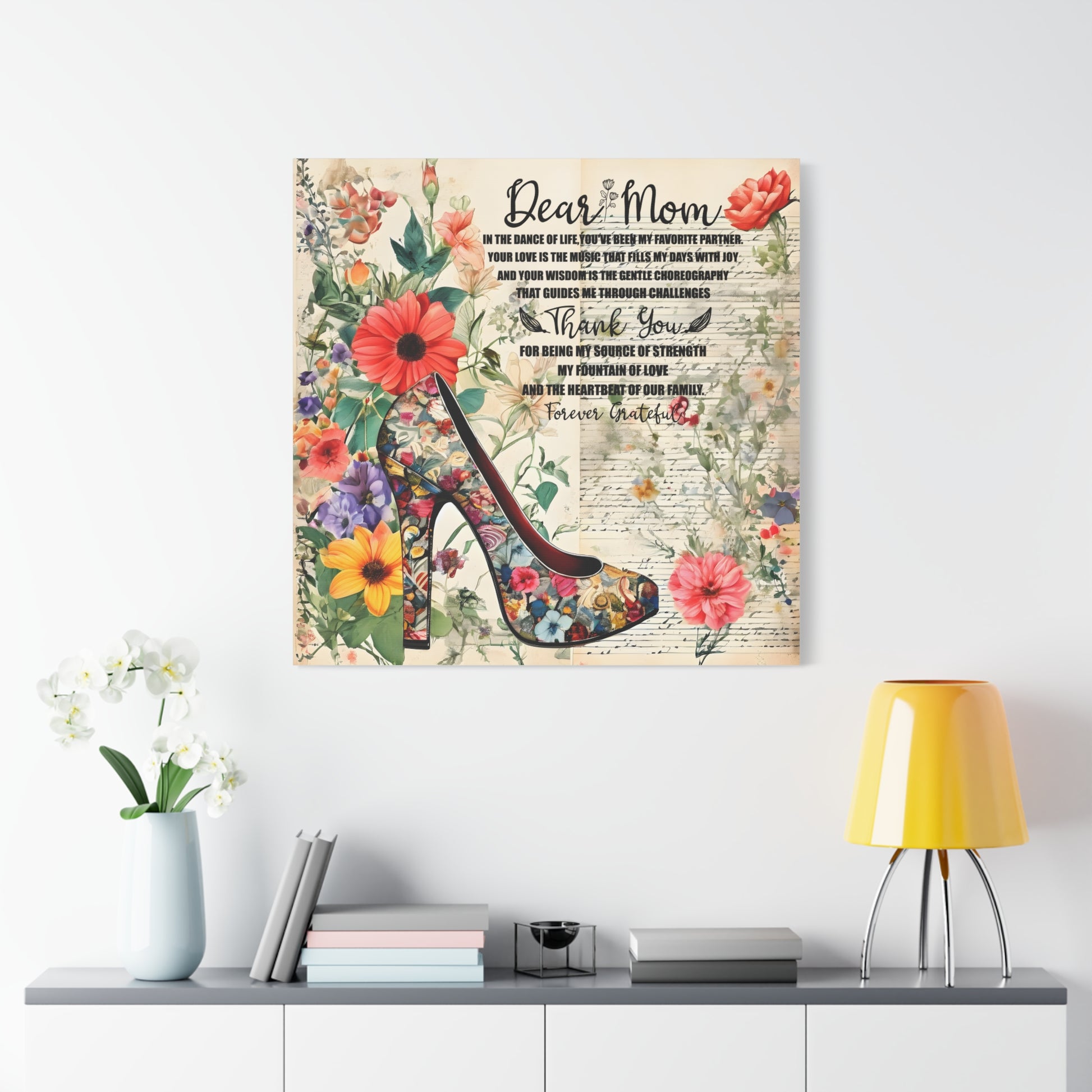 Introducing a beautifully crafted Matte Canvas, a perfect blend of art and heartfelt sentiment. This stunning piece features a floral high-heeled shoe design with an affectionate message to mothers, expressing gratitude and love. Ideal for home decor, it adds a warm and welcoming vibe to any room, making it a thoughtful gift for Mother's Day, birthdays, or simply to celebrate the special bond with your mom. Perfect for those who appreciate artistic expressions of love, this canvas resonates deeply with anyone wishing to cherish their family ties and create a nurturing environment.