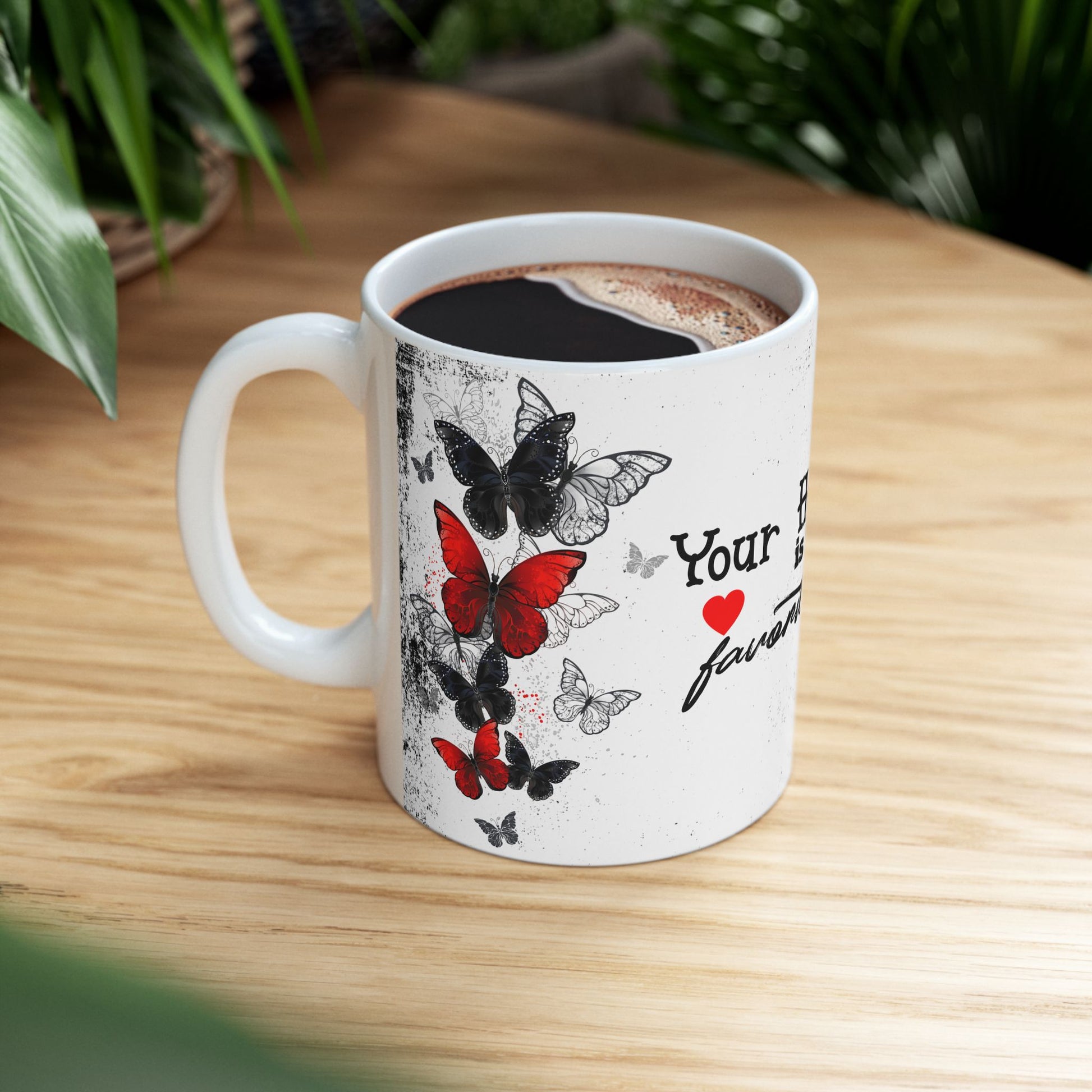 Warm morning light spills across a quiet kitchen. Steam rises from this glossy ceramic mug as soft handwriting and tiny red hearts with butterflies whisper a simple truth: your heartbeat is my favorite song. The design pairs handwritten script with distressed textures and subtle silhouettes, giving the mug a slightly vintage, romantic feel that fits into slow mornings, cozy nights, or a calm moment between busy days. It sits comfortably in the hand thanks to a smooth C-handle and comes in two sizes to match your ritual — a modest 11 oz for espresso-lovers or a generous 15 oz for those who linger over coffee. Built to be lived with, the vibrant print stays bright even after repeated washing and microwave use. This mug belongs on the shelf of someone who keeps small, heartfelt things close: a partner, a longtime friend, or anyone who savors quiet devotion and everyday rituals.