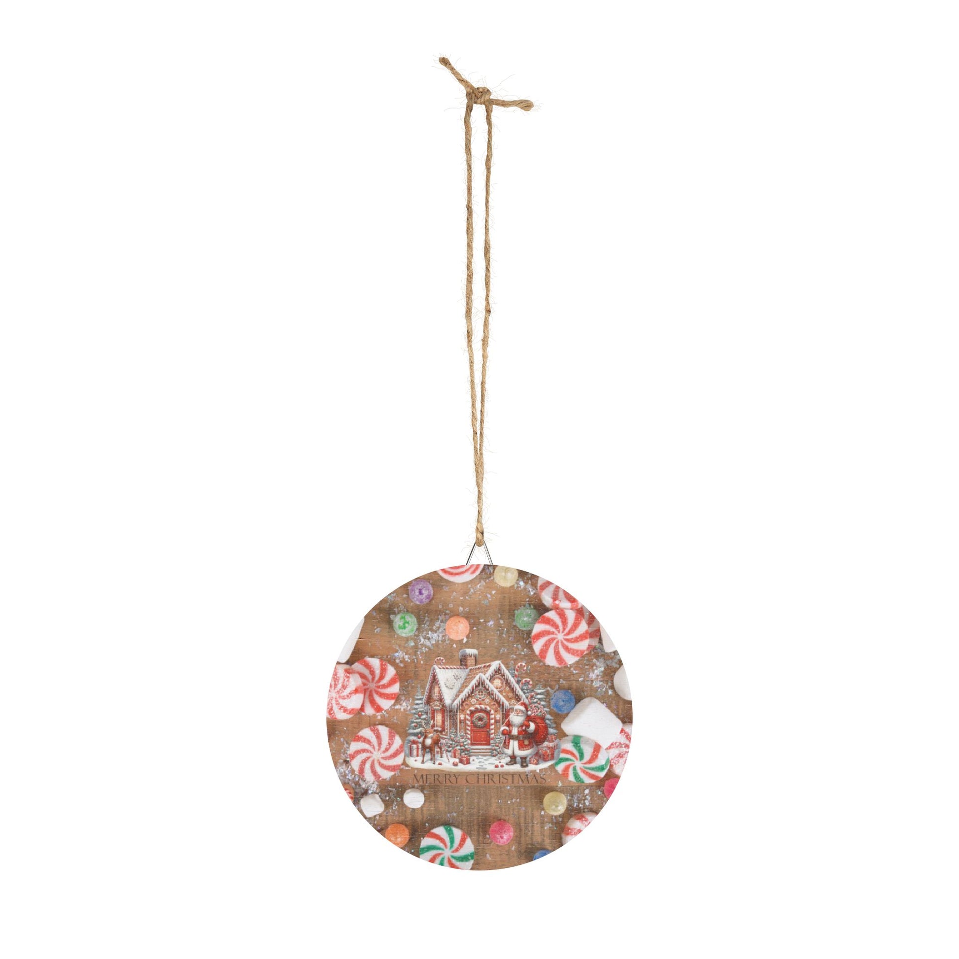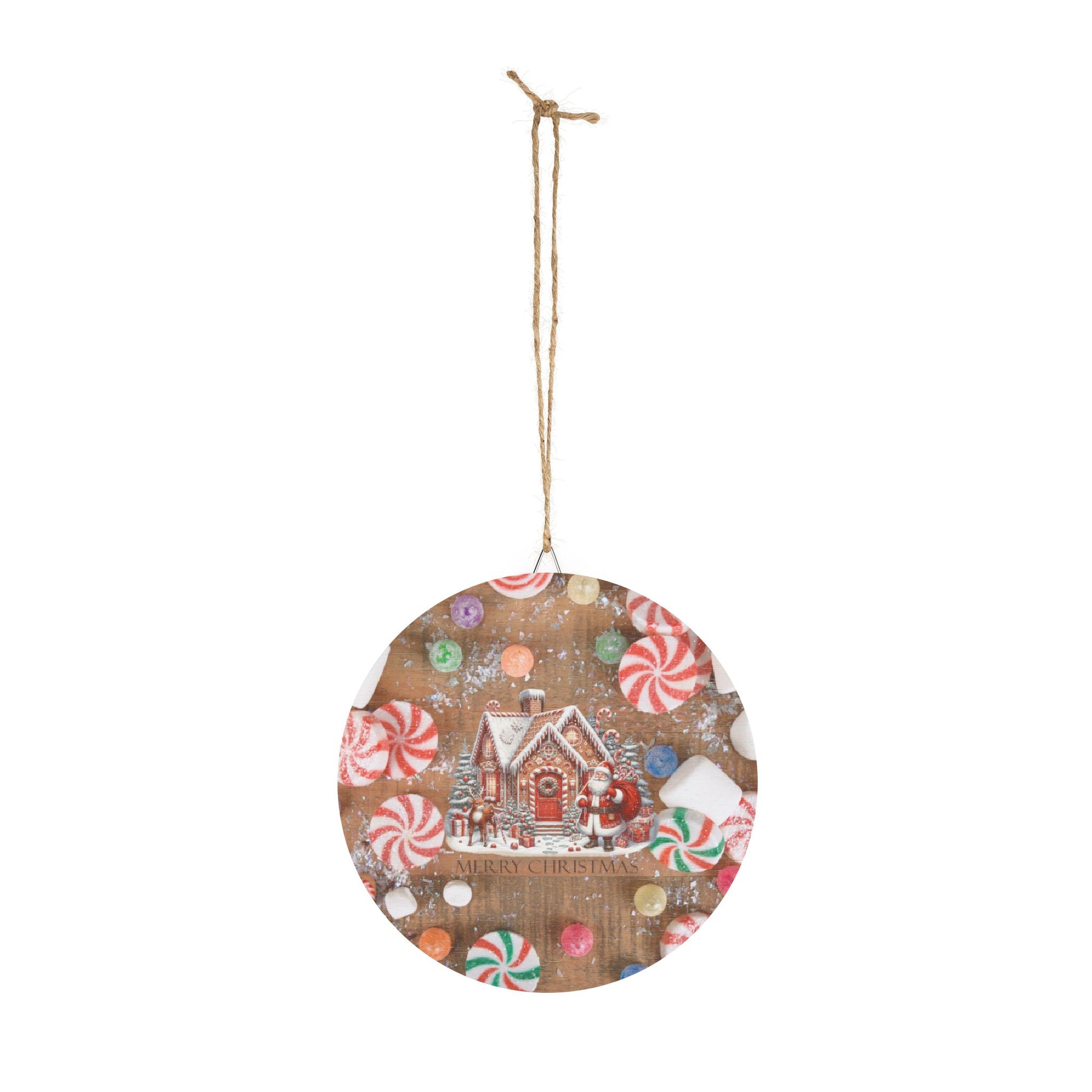 Rustic Charm Gingerbread House & Santa Claus Wood Signs With Candy Background.