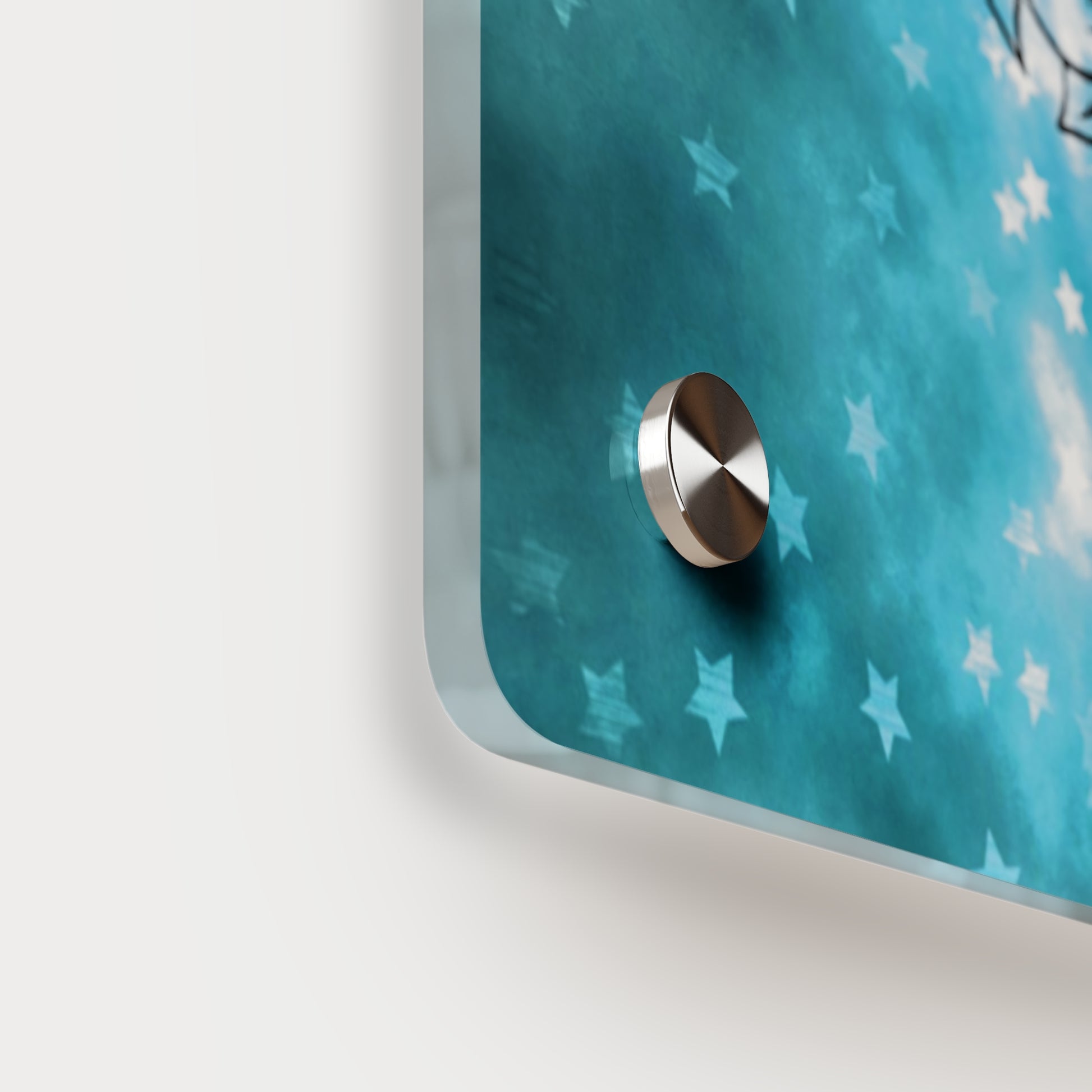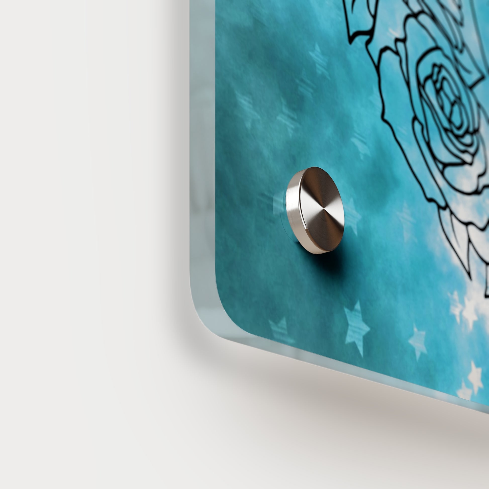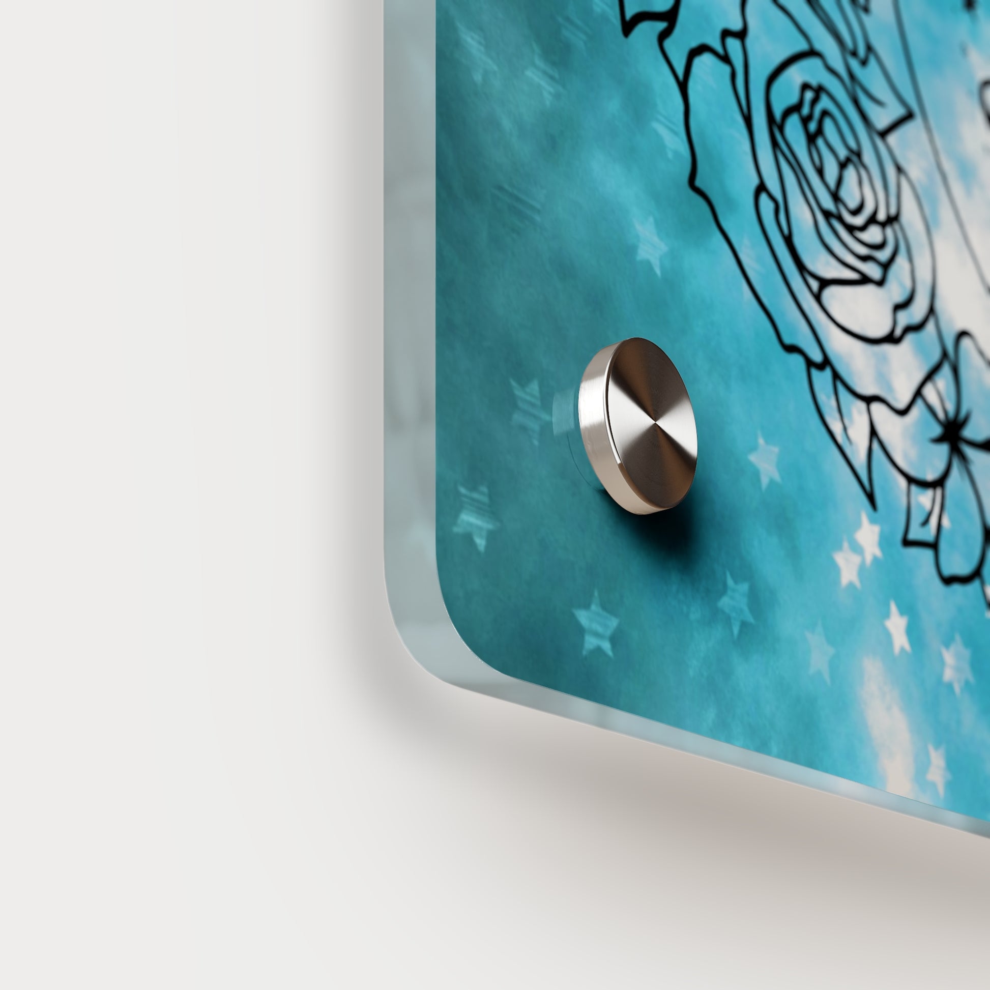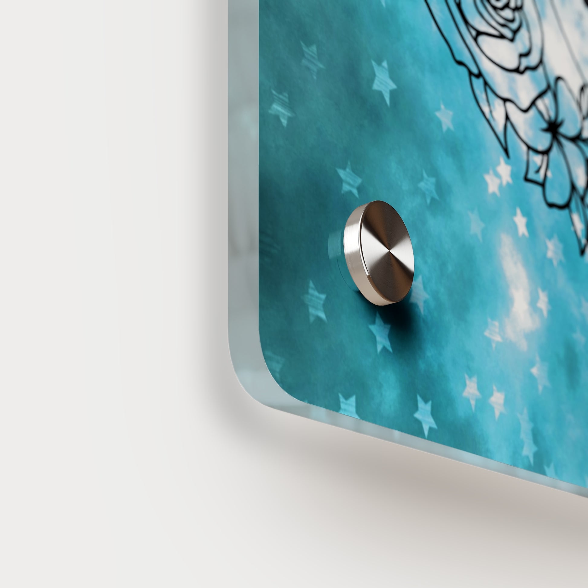 Acrylic art panels are a modern way to display beautiful and vibrant art that looks like it's embedded in clear glass. They have a clear, glossy acrylic surface and a white vinyl backing. Four silver stand-offs make it very easy to mount to the wall. Horizontal 7"x5" panel orientation.