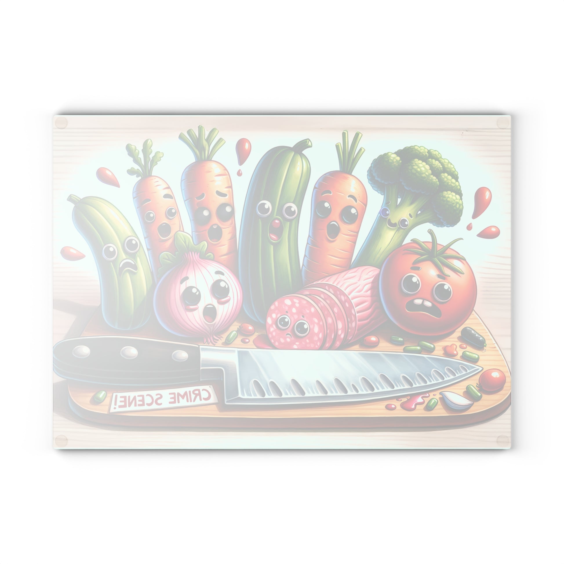 This whimsical glass cutting board features a hilarious 'Crime Scene' vegetable design that brings humor and personality to your kitchen. Perfect for home cooks, foodies, and anyone who loves fun kitchen decor, this durable glass cutting board combines functionality with entertainment. Whether you're chopping vegetables, serving appetizers, or displaying it as kitchen art, this amusing board adds laughter to meal prep!